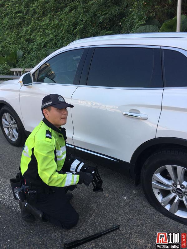 事情發(fā)生在10月11日早上10時30分許,劉先生駕車出外辦事,車輛行駛至東環(huán)高架西往東方向時,突然一聲巨響左后輪輪胎爆裂車輛半路拋錨,當(dāng)時正值交通早高峰,過往車輛不斷,故障車輛停在道路中間導(dǎo)致路段交通擁堵,車主劉先生一時間不知所措,只能留在原地等待救援。此時正在執(zhí)行巡邏任務(wù)的羅湖交警鐵騎組長陳展廷見狀,立即停下警車上前查看情況,了解情況后,為了緩解該路段的交通擁堵,防止出現(xiàn)交通意外,陳展廷立即讓劉先生把車??吭谧钣覀?cè)車道,然后安排隊員用警車在故障車輛周邊設(shè)置出了安全警戒區(qū)域,另一位隊員則對過往車輛進(jìn)行指揮疏導(dǎo)及勸慰駕駛?cè)瞬灰保诎踩珔^(qū)域等待,陳展廷則俯下身為爆胎車輛更換輪胎。約15分鐘的忙碌后,三位鐵騎隊員已滿身是汗,但在他們的密切協(xié)調(diào)配合下,快速幫助駕駛?cè)藙⑾壬鷶[脫困境,險情在最短時間內(nèi)被及時排除,道路交通秩序也恢復(fù)正常,這暖心一幕讓劉先生很是感動,緊緊握著陳展廷同志的手連聲表示感謝。