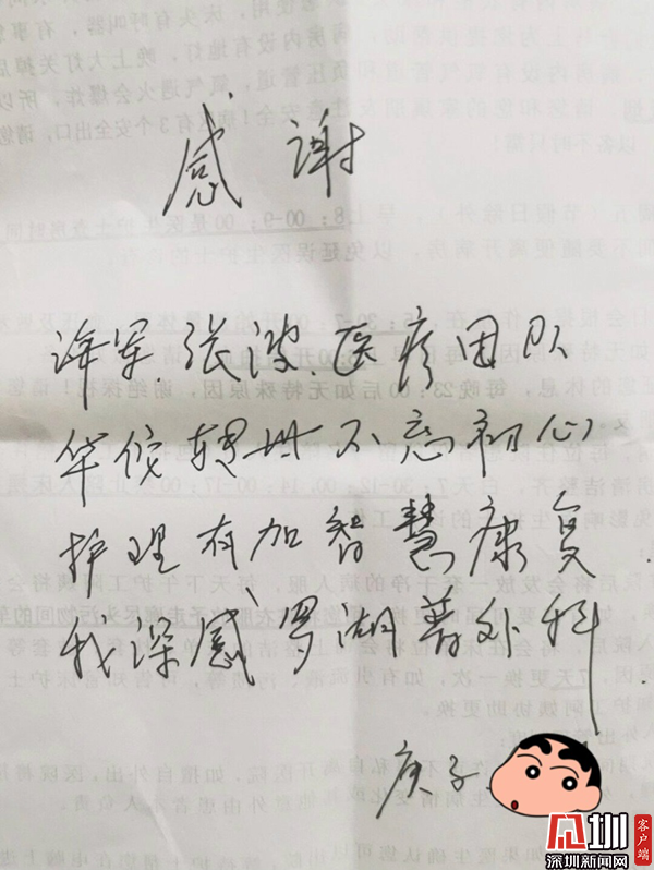 深圳新聞網(wǎng)訊(見圳客戶端、深圳新聞網(wǎng)記者 郭含笑 通訊員 許陽)日前,羅湖醫(yī)院普外科收到了一封來自患者的親筆感謝信,雖然用紙普通,內(nèi)容簡單,但字里行間無不流露出寫信人的感激之情。