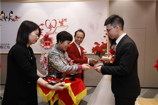 銀婚老人為12對新人頒發(fā)結(jié)婚證