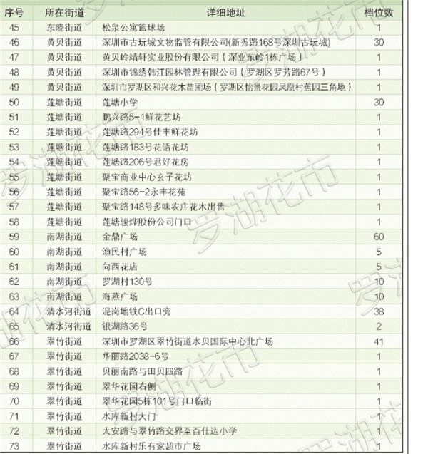 羅湖區(qū)共開設(shè)近500個(gè)花市鋪位,遍布全區(qū)10個(gè)街道,近40個(gè)社區(qū)。同時(shí),羅湖區(qū)還特別制作了花市地圖,最大限度的方便市民就近購花。