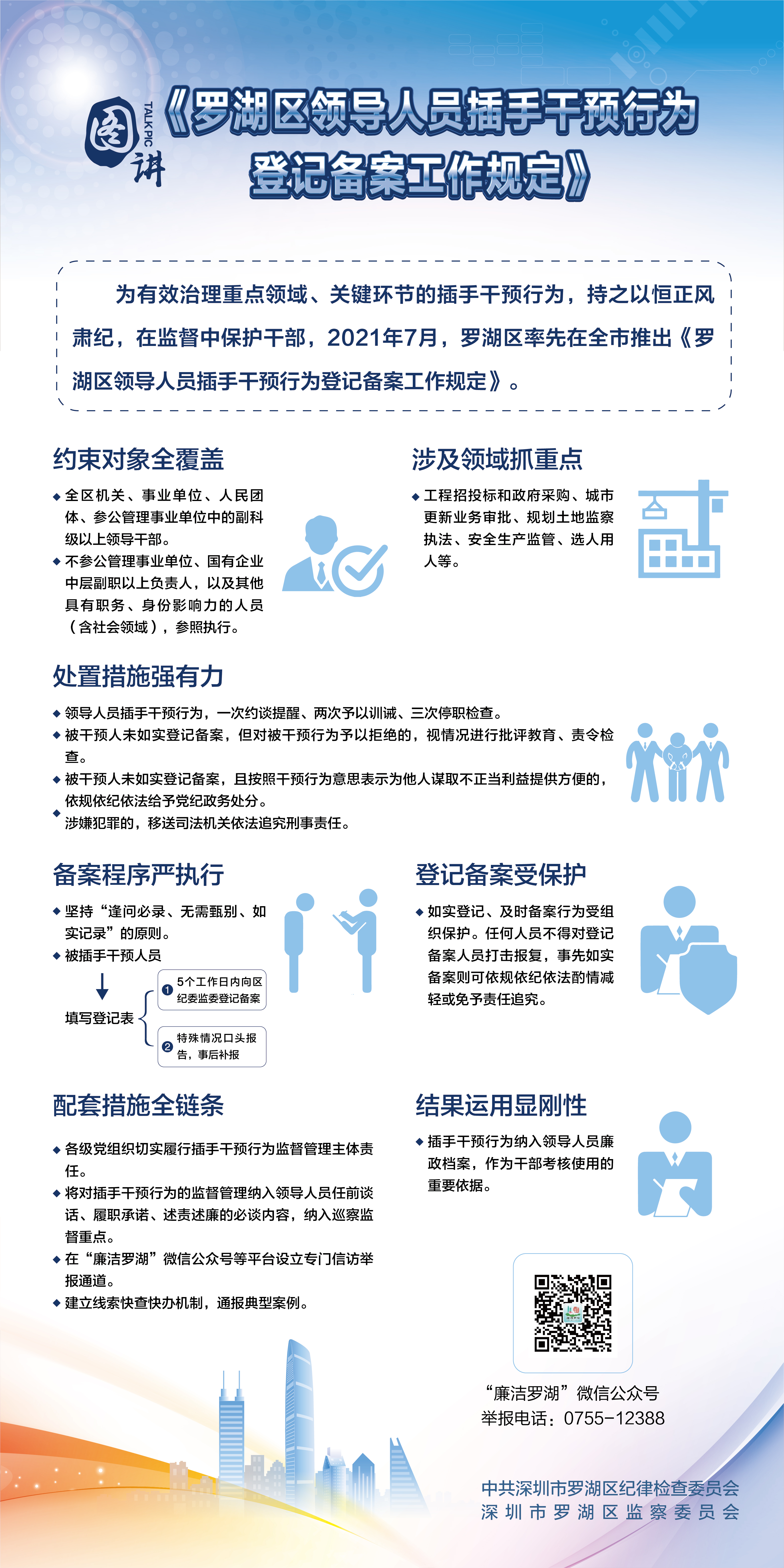 為防范廉政風(fēng)險,在全社會營造不插手干預(yù)的良好氛圍,羅湖區(qū)紀(jì)委監(jiān)委推動出臺《羅湖區(qū)領(lǐng)導(dǎo)人員插手干預(yù)行為登記備案工作規(guī)定》,從工程招投標(biāo)及政府采購、城市更新業(yè)務(wù)審批、規(guī)劃土地監(jiān)察執(zhí)法、安全生產(chǎn)監(jiān)管、選人用人等五個重點領(lǐng)域入手,對全區(qū)機關(guān)事業(yè)單位和社會領(lǐng)域插手干預(yù)行為進行約束,對“打招呼”堅決說“不”。