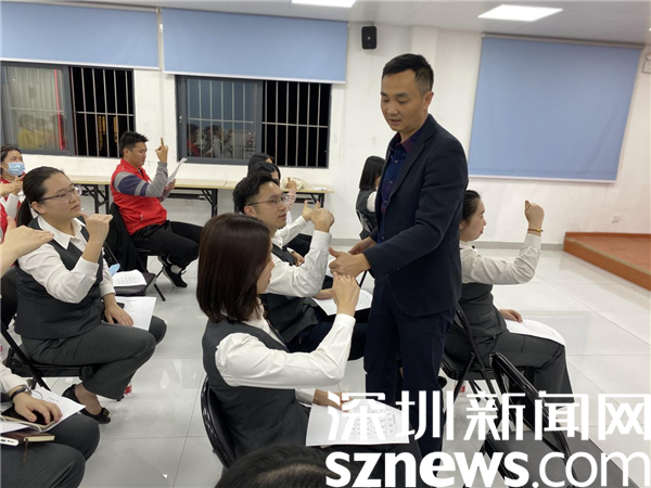 手語(yǔ)培訓(xùn)課上,授課老師首先介紹了手語(yǔ)的意義及語(yǔ)法規(guī)則,然后從手語(yǔ)的基本內(nèi)容教起,包括漢字拼音、數(shù)字、稱謂、常用短語(yǔ)的打法,邊示范、邊講解、邊引導(dǎo)參訓(xùn)人員一同學(xué)習(xí)。