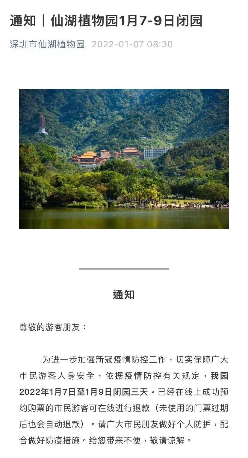 據(jù)深圳市仙湖植物園官方微信號1月7日8點(diǎn)30分發(fā)布的通知, 為進(jìn)一步加強(qiáng)新冠疫情防控工作,切實(shí)保障廣大市民游客人身安全,該園1月7日至1月9日閉園3天。已經(jīng)在線上成功預(yù)約購票的市民游客可在線進(jìn)行退款(未使用的門票過期后也會自動退款)。