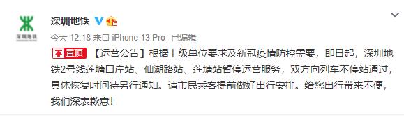根據(jù)上級單位要求及新冠疫情防控需要,即日起,深圳地鐵2號線蓮塘口岸站、仙湖路站、蓮塘站暫停運(yùn)營服務(wù),雙方向列車不停站通過,具體恢復(fù)時間待另行通知。請市民乘客提前做好出行安排。
