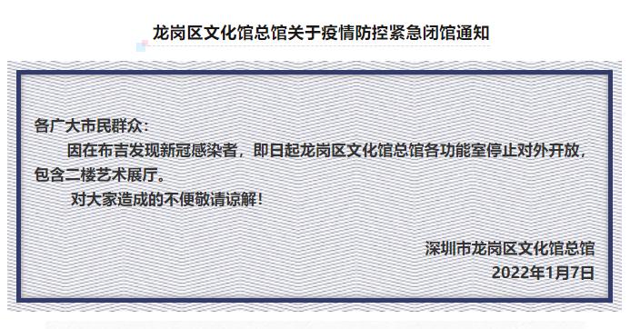 1月7日,深圳市龍崗區(qū)圖書館發(fā)布通知稱,因疫情防控工作需要,為保障市民讀者健康安全,經(jīng)研究決定,區(qū)圖書館在布吉、坂田和吉華三個街道的所有分館,自2022年1月7日起臨時閉館,暫停到館讀者服務(wù)和各項(xiàng)活動,進(jìn)行衛(wèi)生消殺、內(nèi)務(wù)整理等,恢復(fù)開館時間另行通知。