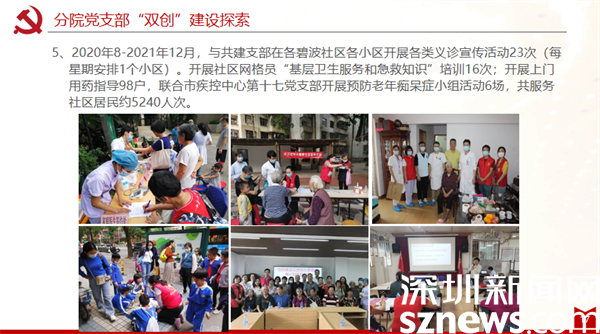 區(qū)中醫(yī)院康復(fù)分院黨支部以黨建引領(lǐng)“雙創(chuàng)”工作取得良好實(shí)效,與黃貝社區(qū)黨委的共建和交叉任職推動(dòng)醫(yī)療資源和社區(qū)服務(wù)的資源共享,把“社區(qū)關(guān)愛服務(wù)”落到實(shí)處。通過黨組織聯(lián)動(dòng),增強(qiáng)了居民與醫(yī)護(hù)之間的溝通聯(lián)系,有力推動(dòng)65歲老人體檢和疫苗接種,大大提升居民認(rèn)可度、滿意度。康復(fù)分院黨支部與社區(qū)黨支部和黨員義工合作,為轄區(qū)內(nèi)70歲以上生活不便孤寡老人提供全方位的關(guān)愛服務(wù),開展上門訪視服務(wù)535人次;深入各小區(qū)開展各類義診宣傳、健康知識(shí)推廣活動(dòng)等36場(chǎng),惠及居民5000余人。
