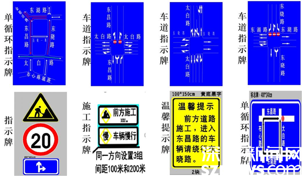 標(biāo)志標(biāo)線調(diào)整。東昌路等片區(qū)道路實施小范圍單循環(huán)后,涉及東昌路、太白路、東曉路、東湖路、昌曉一路等周邊道路標(biāo)志標(biāo)線重新調(diào)整,在施工上游路段設(shè)置施工提示牌,道路交叉口設(shè)置車道指示牌,提示過往車輛按照導(dǎo)行標(biāo)志標(biāo)線單向行駛。