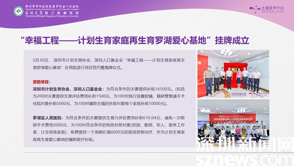 今年初,深圳市計劃生育協(xié)會、人口基金會就創(chuàng)建了一項“幸福工程”,旨在為計劃生育家庭再生育提供幫助。今年5月30日,第一個幸福工程基地就選擇坐落于羅湖醫(yī)院,項目為符合條件的夫妻提供總額高達16500元的醫(yī)療補貼,同時,羅湖醫(yī)院還給予相應(yīng)的醫(yī)療減免,包括手術(shù)及藥品費用的配套補貼。為居民再生育提供了很好的幫助,大大降低了經(jīng)濟壓力,讓更多的家庭愿意再生育。