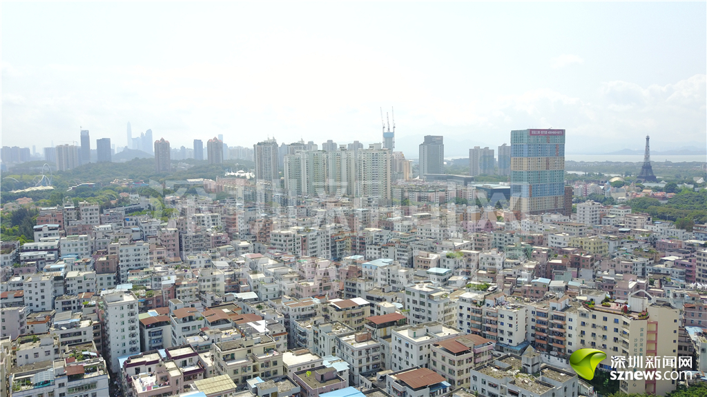從白石洲低矮的“握手樓”上空看去,世界之窗標志性建筑“埃菲爾鐵塔”依稀可見