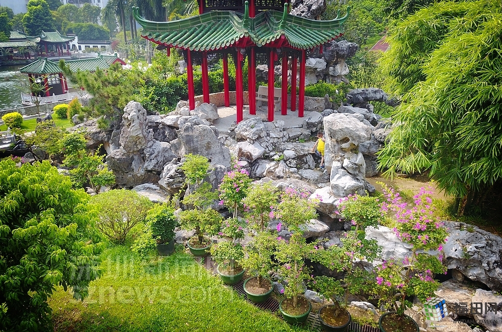 園內(nèi)有古樹,且樹木成蔭、古亭假山小橋流水,景色怡人。