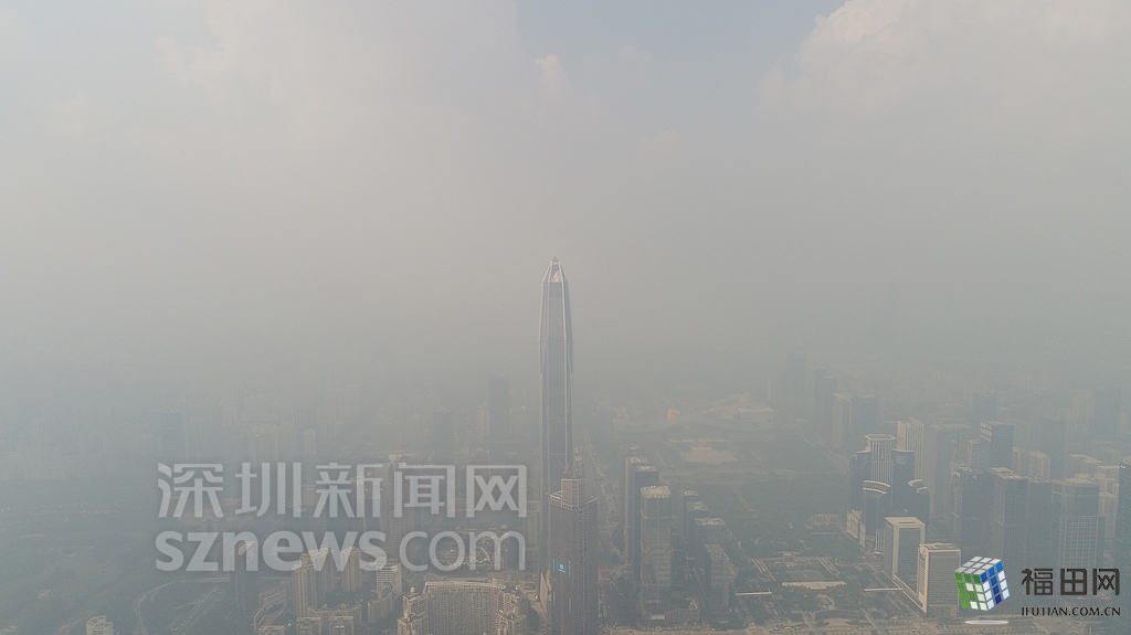 無人機在數(shù)百米高空俯瞰灰霾籠罩下的深圳中心區(qū),大半個城區(qū)都看不清楚。