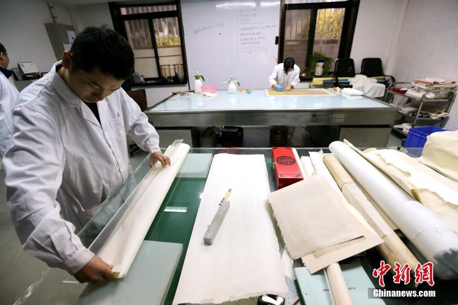 “文物醫(yī)生”在“書畫文物修復室”內工作。中新社記者 張遠 攝