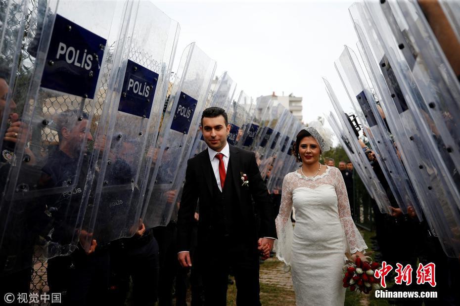 當?shù)貢r間2018年3月21日,土耳其安塔利亞,警官Ceren Ekici和Taha YasinGul舉行婚禮。在10個月前的一次行動中,Taha YasinGul不慎開槍擊中Ceren Ekici的頭部,所幸沒有造成生命危險。他們的婚禮由警局同事操辦,同事們舉著防彈盾牌,護送這對新人走向禮臺。圖片來源:視覺中國