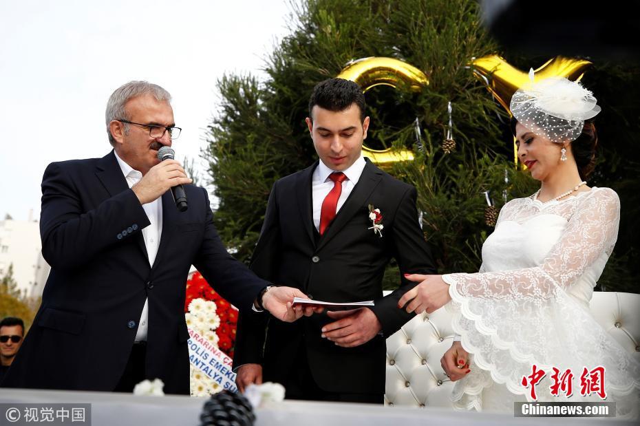 當(dāng)?shù)貢r間2018年3月21日,土耳其安塔利亞,警官Ceren Ekici和Taha YasinGul舉行婚禮。在10個月前的一次行動中,Taha YasinGul不慎開槍擊中Ceren Ekici的頭部,所幸沒有造成生命危險。他們的婚禮由警局同事操辦,同事們舉著防彈盾牌,護送這對新人走向禮臺。圖片來源:視覺中國