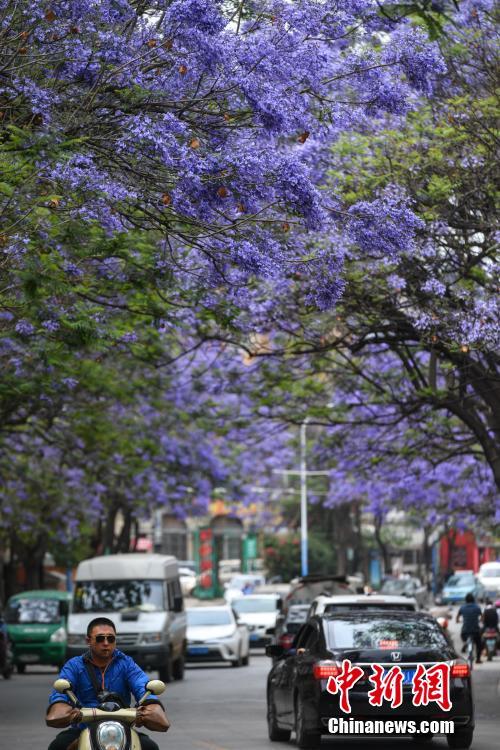 5月2日,昆明市區(qū)一道路兩旁的藍(lán)花楹盛開,民眾在“花街”穿行。 中新社記者 任東 攝