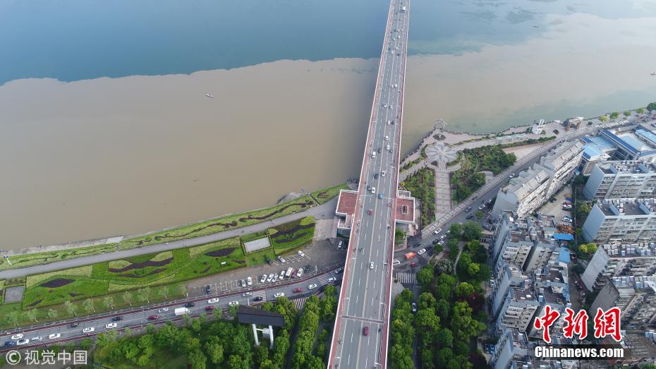 5月7日,湖北省襄陽市,無人機(jī)航拍的漢江長虹大橋處涇渭分明的漢江水面。強(qiáng)暴雨沖刷經(jīng)過去冬今春的田野地表積累的塵土,經(jīng)支流與主河道匯入時(shí),充滿污泥的洪水與主河道上清澈的丹江水形成難得一見的涇渭分明景觀。王虎攝 圖片來源:視覺中國