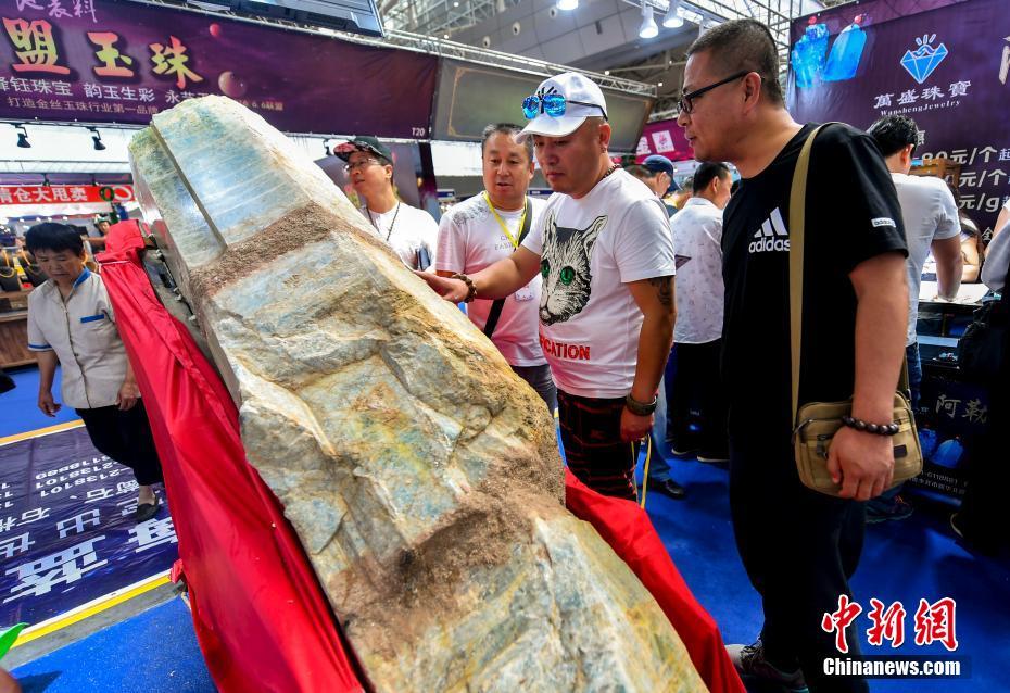 6月15日,第十一屆新疆觀賞石、和田玉精品博覽會在位于新疆烏魯木齊市紅光山的新疆國際會展中心開幕,本次博覽會參展種類涵蓋珠寶、玉石、礦石、隕石、觀賞石等,吸引眾多奇石玩家到場“以石會友”,打造獨(dú)具特色的“品石”盛宴。圖為產(chǎn)自新疆阿勒泰地區(qū)富蘊(yùn)縣庫瑪拉山重量近1噸、價(jià)值1.5億元人民幣的海藍(lán)寶原礦石。中新社記者劉新 攝