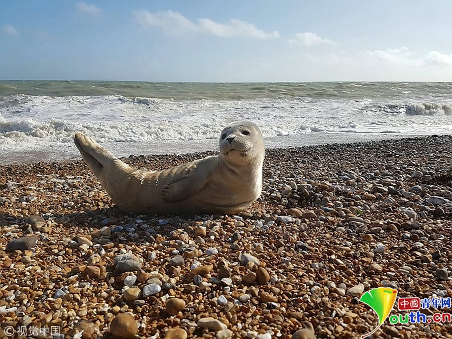 英國(guó)肯特郡鄧杰內(nèi)斯,46歲的達(dá)倫·伍德帶著鄰居家的孩子們釣魚,這只可愛的海豹爬出海面跟他們“打招呼”。