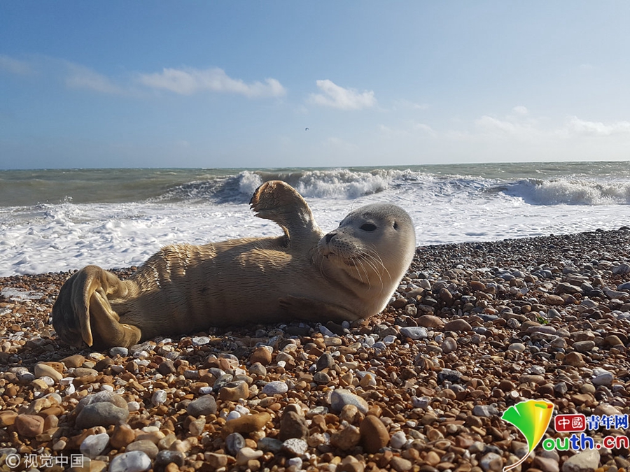 小海豹拍打尾巴,對著鏡頭“微笑”。