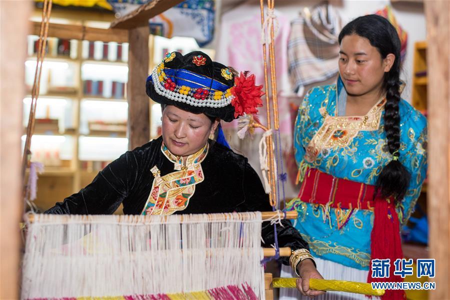摩梭姑娘邊巴拉姆(右)在寧蒗永寧鄉(xiāng)落水村的摩梭民俗博物館里向傳承人旦史拉措學(xué)習(xí)摩梭人傳統(tǒng)的織布方式(7月30日攝)。新華社記者 胡超 攝