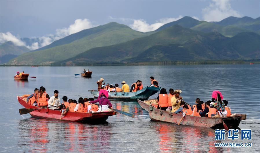 游客在瀘沽湖上坐船游覽(7月30日攝)。如今寧蒗永寧鄉(xiāng)落水村的摩梭群眾靠旅游服務(wù)實現(xiàn)脫貧致富。 新華社記者 藺以光攝