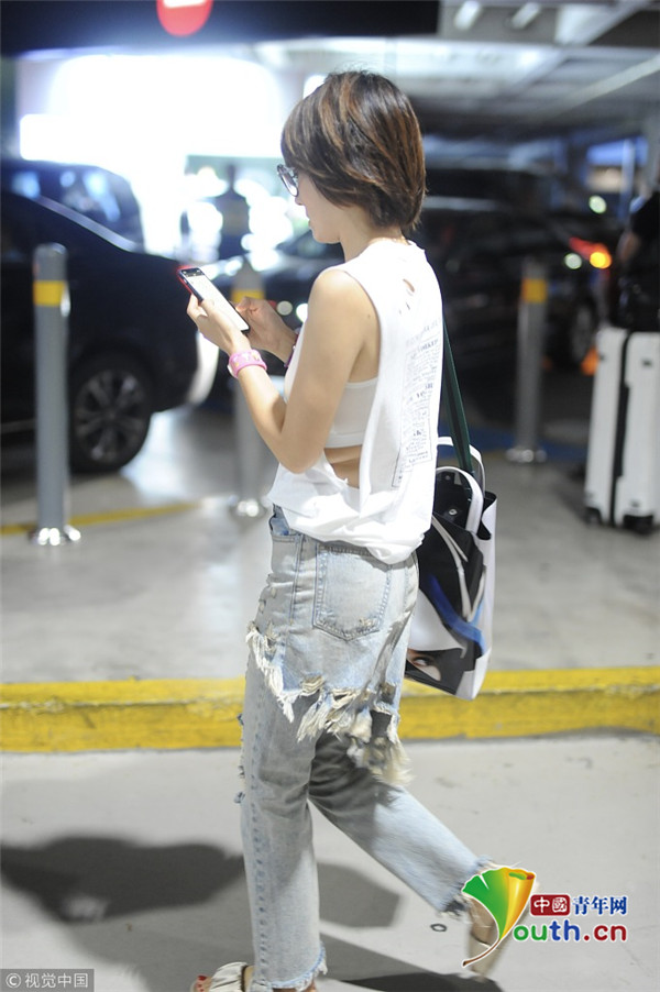 2018年8月20日,上海,馬伊琍現(xiàn)身機場,她身穿清爽白T,小蠻腰隱現(xiàn),搭配“乞丐風”破洞褲扮潮,一路低頭走狂刷手機。