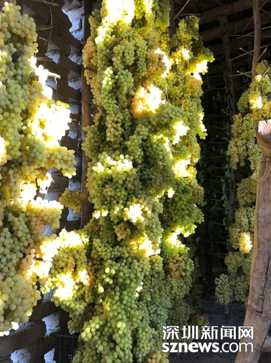 鏤空的土磚房具有良好的通透性,把葡萄搭在干樹(shù)枝上一層層碼起來(lái)高達(dá)屋頂,慢慢就會(huì)失去水分自然晾成葡萄干了。趙春麗攝