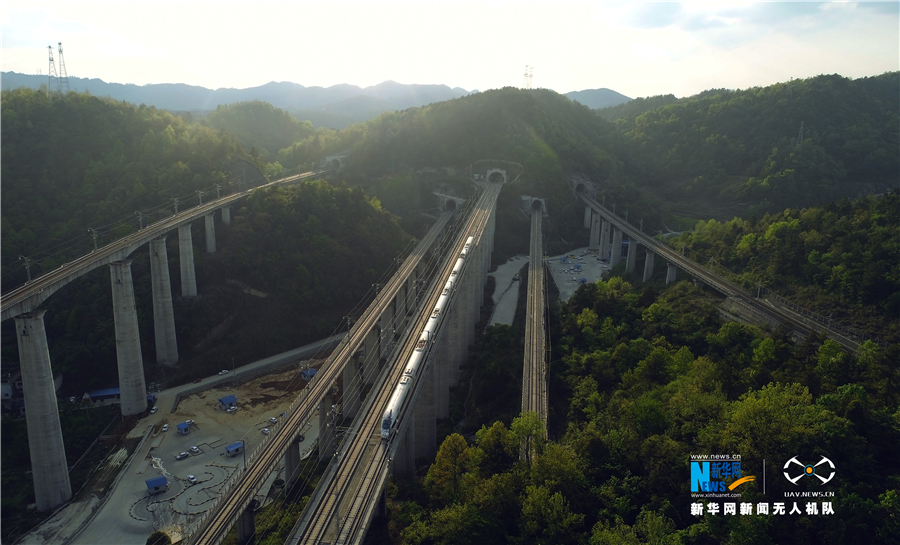 貴州省地處中國(guó)西南腹地,全省高原山地居多,因此高鐵建設(shè)的橋隧占比較高。在貴陽市烏當(dāng)區(qū)新添寨,高鐵滬昆線、貴廣客運(yùn)專線、貴開城際客運(yùn)專線的隧道和橋梁交織在一起,形成“五洞五橋”并行,形似“五龍出?!钡膲延^景象(3月29日攝)。新華網(wǎng)盧志佳 攝