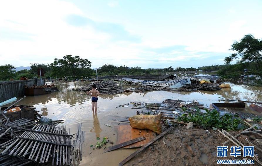9月18日,在廣東省陽(yáng)江市陽(yáng)春市,一名兒童站在水浸的村莊里。 新華社記者張加揚(yáng)攝