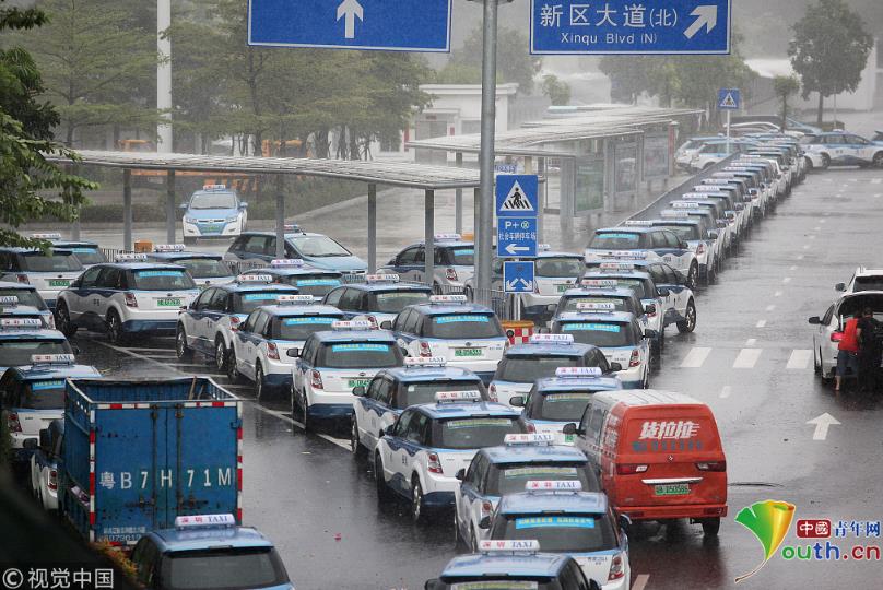 2018年9月16日,受臺風(fēng)山竹影響,全市的電動車充電站暫停使用。深圳市民樂P+R停車場外,停滿了等待充電站開門的電動出租車。