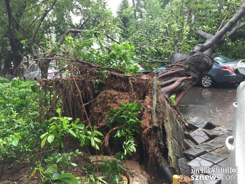 在蓮花北村靠近北環(huán)中學(xué)的小路,記者注意到拉起警戒線,有多株樹木經(jīng)不住大風(fēng)考驗,已投降就地倒下。