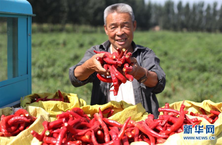 9月16日,阜城縣王集鄉(xiāng)南張莊村農(nóng)民在展示采摘的辣椒。近年來(lái),河北省阜城縣王集鄉(xiāng)在推進(jìn)產(chǎn)業(yè)富民過(guò)程中,積極引導(dǎo)農(nóng)民調(diào)整農(nóng)業(yè)產(chǎn)業(yè)結(jié)構(gòu),按照品種特色化、種植規(guī)模化、產(chǎn)銷(xiāo)一體化的“公司+基地+農(nóng)戶(hù)”的經(jīng)營(yíng)模式,鼓勵(lì)農(nóng)民發(fā)展特色辣椒種植,推行“訂單種植”模式,開(kāi)辟出了一條農(nóng)民創(chuàng)收新路徑。目前,阜城縣王集鄉(xiāng)辣椒種植面積3100余畝,每畝年收益2500元以上,帶動(dòng)當(dāng)?shù)剞r(nóng)民實(shí)現(xiàn)增收。新華社記者朱旭東攝