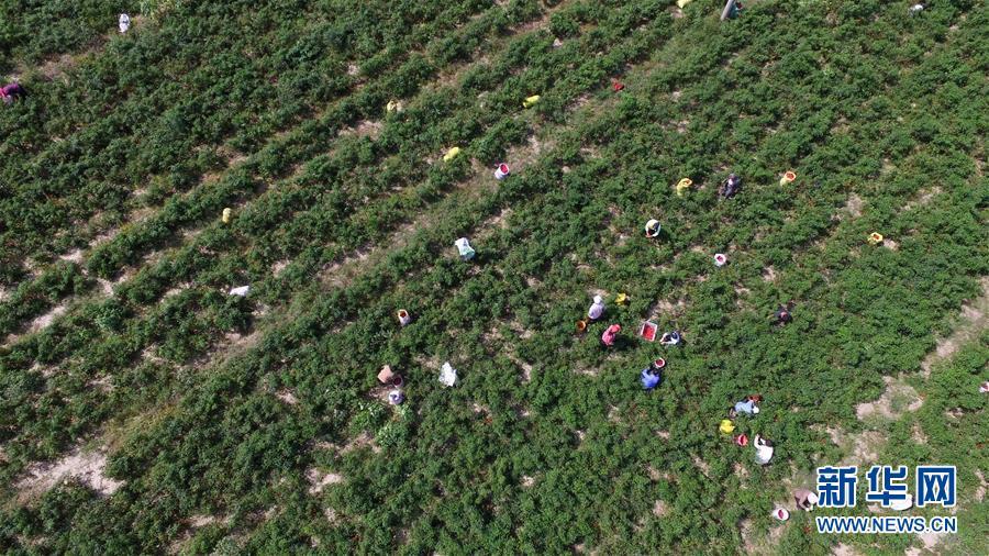 9月16日,阜城縣王集鄉(xiāng)南張莊村農(nóng)民在采摘辣椒(無(wú)人機(jī)拍攝)。近年來(lái),河北省阜城縣王集鄉(xiāng)在推進(jìn)產(chǎn)業(yè)富民過(guò)程中,積極引導(dǎo)農(nóng)民調(diào)整農(nóng)業(yè)產(chǎn)業(yè)結(jié)構(gòu),按照品種特色化、種植規(guī)模化、產(chǎn)銷(xiāo)一體化的“公司+基地+農(nóng)戶(hù)”的經(jīng)營(yíng)模式,鼓勵(lì)農(nóng)民發(fā)展特色辣椒種植,推行“訂單種植”模式,開(kāi)辟出了一條農(nóng)民創(chuàng)收新路徑。目前,阜城縣王集鄉(xiāng)辣椒種植面積3100余畝,每畝年收益2500元以上,帶動(dòng)當(dāng)?shù)剞r(nóng)民實(shí)現(xiàn)增收。新華社記者朱旭東攝