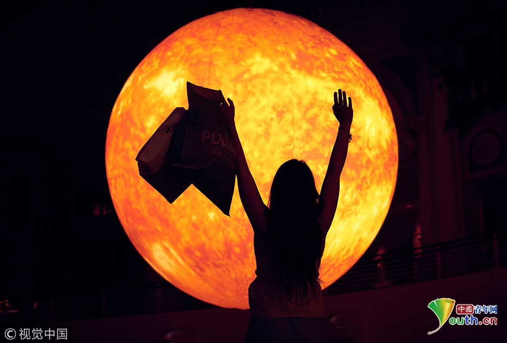 當(dāng)?shù)貢r(shí)間2018年9月18日,英國曼切斯特,顧客們在特拉福德購物中心的一個(gè)巨型的“太陽”下享受室內(nèi)日光浴,感受英國未完的史上最熱夏天。這個(gè)人造“太陽”的亮度相當(dāng)于1.2萬個(gè)燈泡。圖片來源:視覺中國