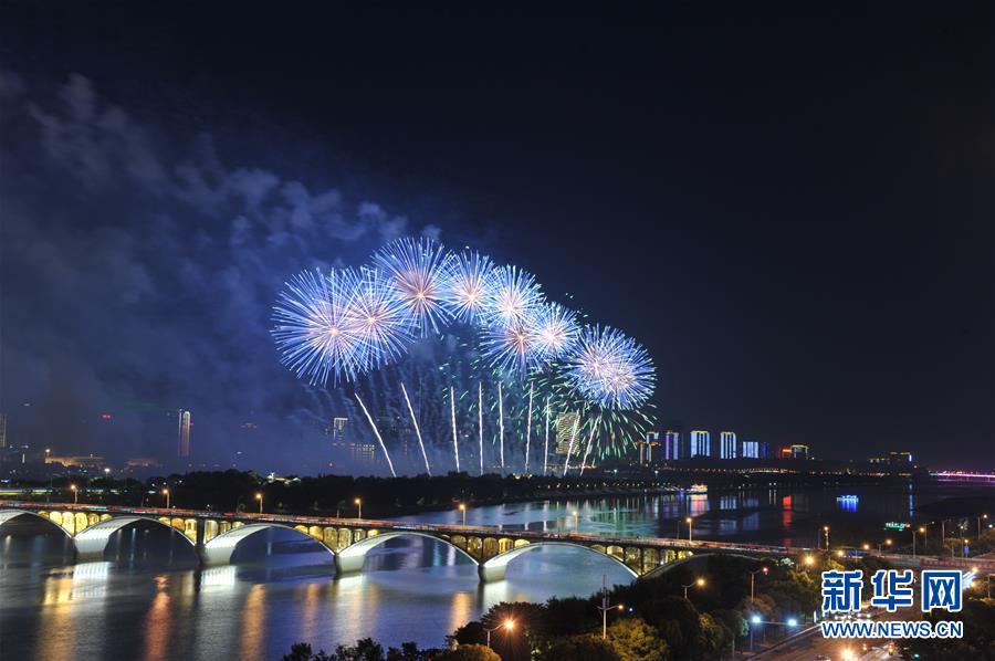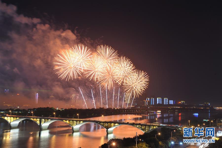 9月19日晚,湖南省長沙市在湘江橘子洲舉辦焰火晚會,絢麗的焰火與湘江兩岸的城市夜景交相輝映。