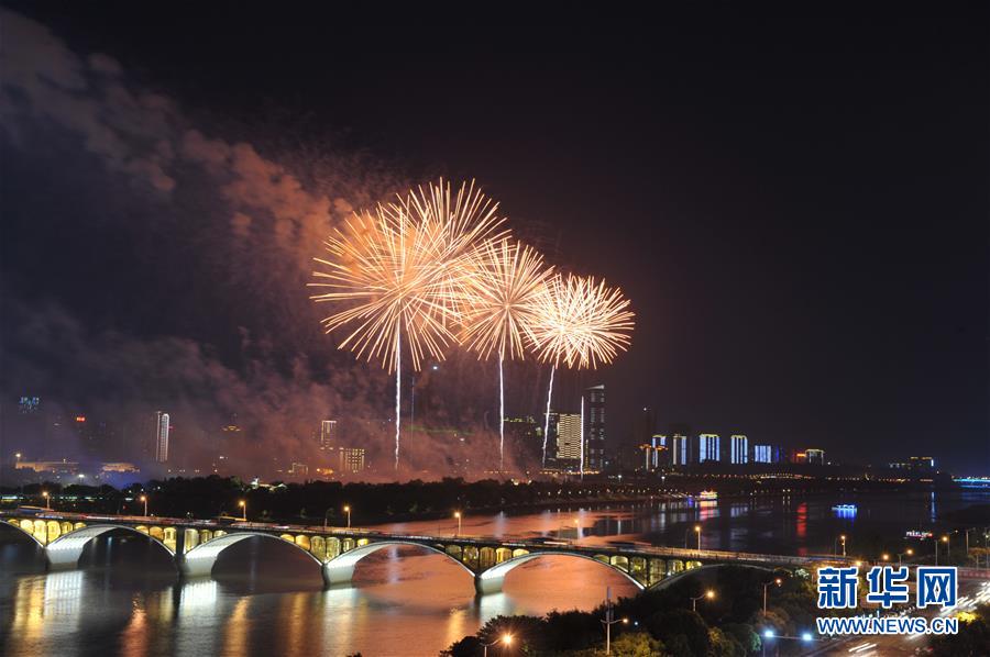 這是9月19日拍攝的長沙湘江橘子洲焰火晚會現(xiàn)場。新華社記者 龍弘濤 攝