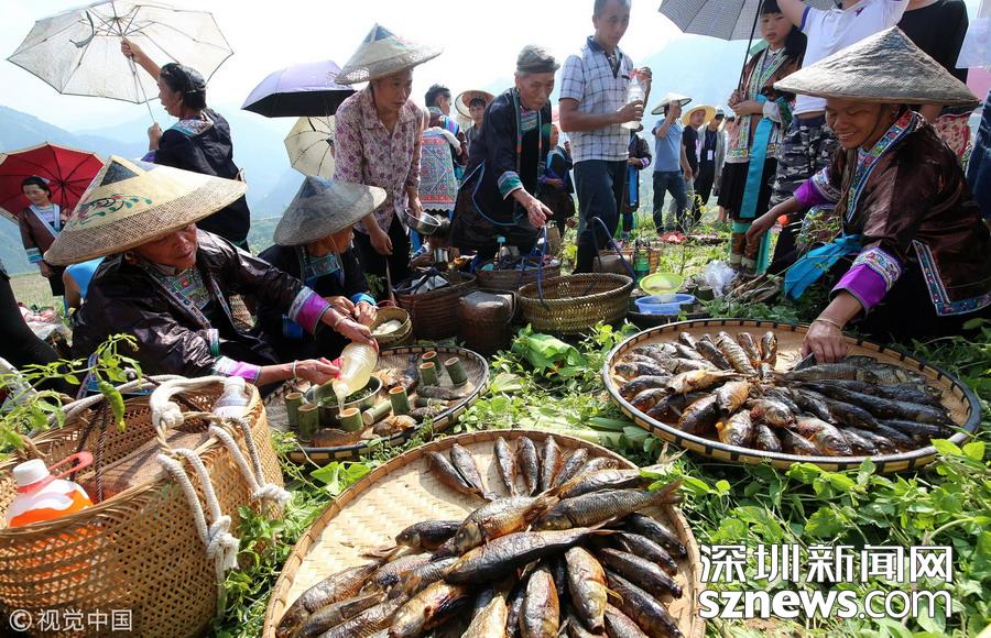 2016年9月17日,貴州省榕江縣平陽鄉(xiāng)硐里村七位侗家婦女們正燒魚。每年中秋時節(jié),當(dāng)?shù)囟弊逋_田放水,捉魚,全寨男女老少,野外生起篝火烤魚,用烤魚、米酒等,祭祀魚神,祈禱魚糧豐收的傳統(tǒng)民俗活動。