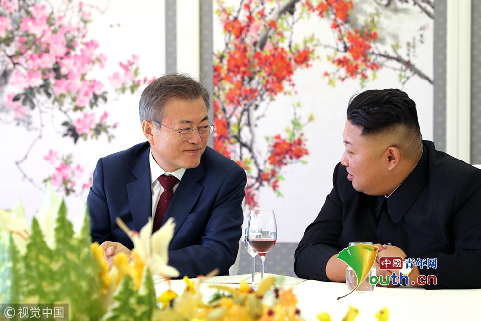 當(dāng)?shù)貢r(shí)間2018年9月20日,朝鮮,韓國(guó)總統(tǒng)文在寅在三池淵招待所和金正恩夫婦一起共進(jìn)午餐。圖片作者:Yonhap News Agency/視覺中國(guó)