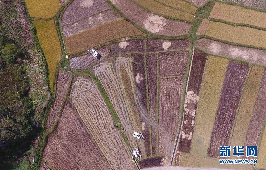 9月20日,廣南縣八寶鎮(zhèn)壩龍村的農民在用收割機收稻谷(無人機拍攝)。 云南省文山壯族苗族自治州廣南縣八寶鎮(zhèn)今年種植優(yōu)質水稻22000余畝,秋收季節(jié),田野里一片金黃,景色如畫。 新華社記者楊宗友攝