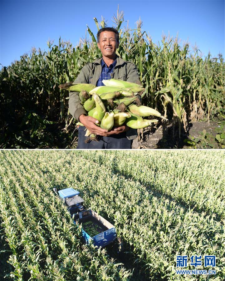 這張拼版照片顯示的是:上圖,9月18日,黑龍江省綏化市青岡縣禎祥鎮(zhèn)莊稼屯村民莊秀彬捧著剛收獲的玉米;下圖,9月18日,莊秀彬駕駛農(nóng)機(jī)收獲玉米(無人機(jī)拍攝)。 新華社記者王凱攝