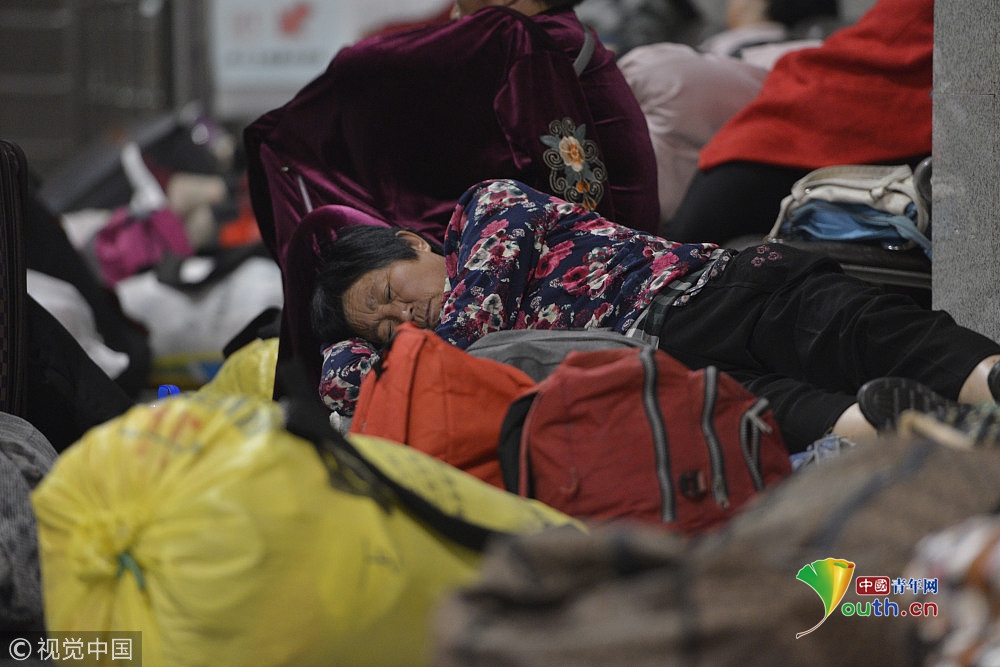 2018年9月15日,在鄭州火車站候車大廳,來自周口西華縣農(nóng)村的數(shù)百名采棉工,為趕早上4點(diǎn)50分的火車,在火車室打地鋪休息。