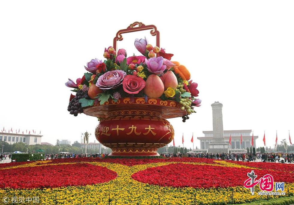 2017年天安門廣場大花籃以喜慶的花果籃為主景,花籃頂高17米,籃體高15.3米,底部直徑達50米。籃體南側(cè)寫有“祝福祖國、1949-2017”,北側(cè)寫有“喜迎十九大” 字樣?;ü@內(nèi)共使用主花56朵(牡丹、月季、玉蘭、金桂、迎春花、蘋果花、紫藤花、文心蘭、葉子花),其中最大牡丹直徑3.2米,果實6種(石榴、桃、柿子、蘋果、海棠、葡萄)。寓意吉祥的果實和花卉,象征十八大以來,黨和國家在各個領(lǐng)域取得的輝煌成就,碩果累累。底部花壇采用心形圖案,寓意紅心向黨,象征著全國人民緊密團結(jié)在以習近平同志為核心的黨中央周圍,表達對祖國繁榮富強、欣欣向榮的美好祝福。