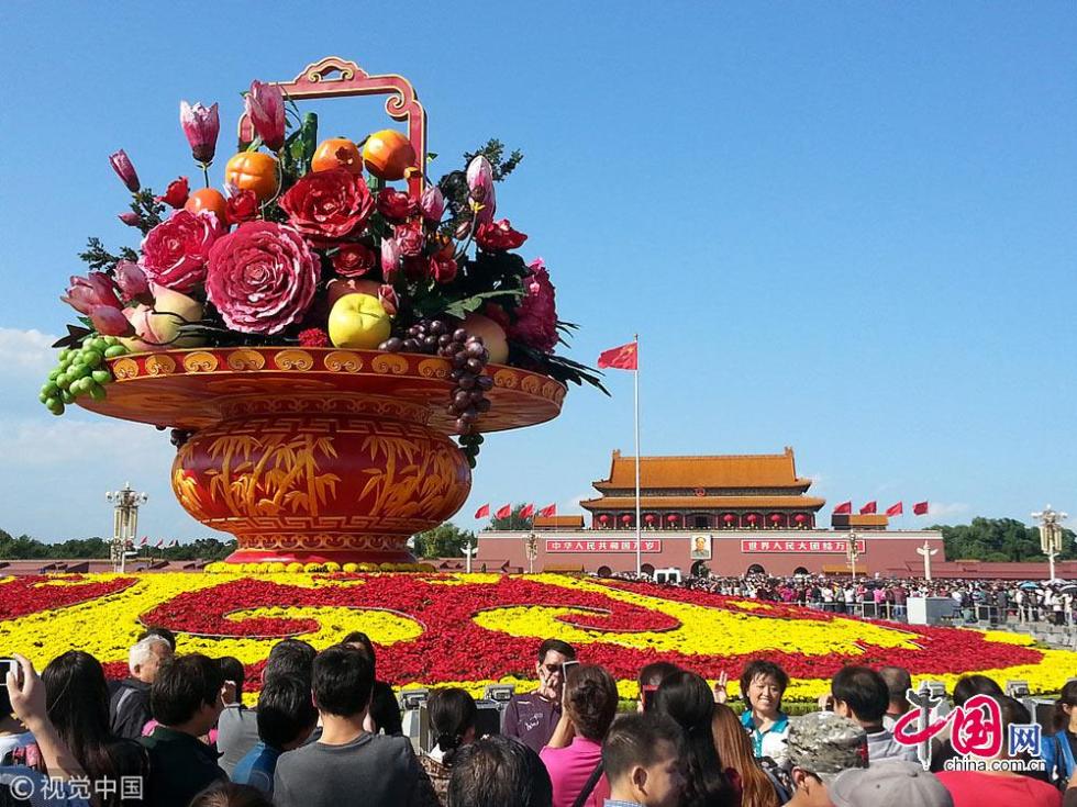 2013年天安門廣場首次以花果籃的形式布置國慶主花壇,國慶花籃名為“祝福祖國”,高達18.2米,籃盤直徑達到15米,中心花壇直徑達到50米,是天安門廣場歷年最大的花籃。本次的花果籃使用牡丹、玉蘭、松枝、竹子四個品種的大型仿真花,并創(chuàng)新融合石榴、蘋果、蟠桃、葡萄等水果造型,表達了富貴吉祥、平安幸福、節(jié)節(jié)高升等良好寓意。除了仿真的花果,施工方還在花果籃中穿插擺放大規(guī)格三角梅、一品紅等盆栽花卉。據(jù)了解,本次花果籃內(nèi)的三角梅是首次進入天安門國慶花壇主景。此外,“籃子”采用玻璃鋼材料,可以重復(fù)利用。 據(jù)了解,如此巨大的花果籃可抵抗10級大風(fēng)。