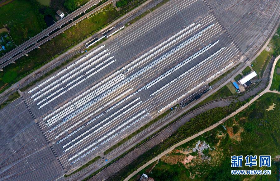 這是廣西南寧動(dòng)車所內(nèi)準(zhǔn)備發(fā)往各地的動(dòng)車組列車(7月1日無人機(jī)拍攝)。 廣西壯族自治區(qū)成立60年來,鐵路建設(shè)發(fā)生翻天覆地的變化。來自中國(guó)鐵路南寧局集團(tuán)有限公司的數(shù)據(jù)顯示,1958年廣西鐵路總里程為1346.3公里,如今廣西鐵路總里程達(dá)5191公里。廣西與周邊相鄰省份間實(shí)現(xiàn)動(dòng)車“公交化”開行。此外,北部灣港—重慶班列、東盟海產(chǎn)品冷鏈班列、“百色一號(hào)”果蔬專列等的開通和運(yùn)營(yíng),強(qiáng)化了鐵路供給的針對(duì)性和有效性。鐵路成為助推廣西經(jīng)濟(jì)社會(huì)快速發(fā)展的“大動(dòng)脈”。 新華社記者黃孝邦攝