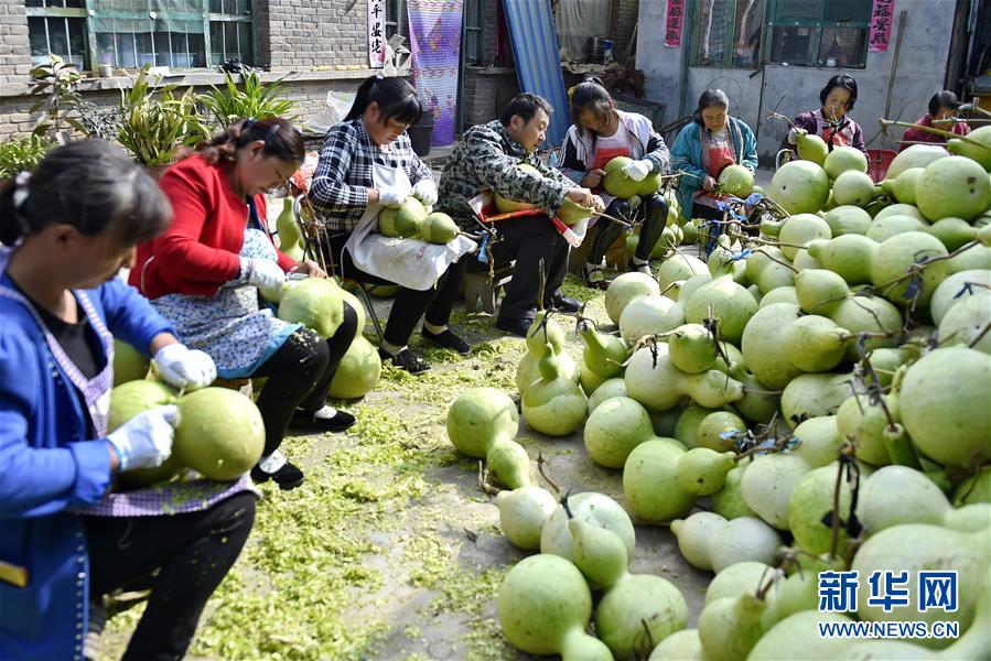 9月27日,山西省安澤縣和川鎮(zhèn)孔旺村的村民將葫蘆去皮。近日,山西省安澤縣和川鎮(zhèn)孔旺村種植的葫蘆喜獲豐收,村民們忙著將摘下的葫蘆去皮晾干??淄逵?016年成立葫蘆種植合作社,種植、采摘、加工等環(huán)節(jié)全部由貧困戶負(fù)責(zé),為貧困戶拓寬增收渠道。新華社記者 曹陽 攝