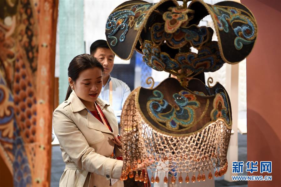 9月27日,在敦煌國際會展中心,參觀者欣賞展出的藝術(shù)品。