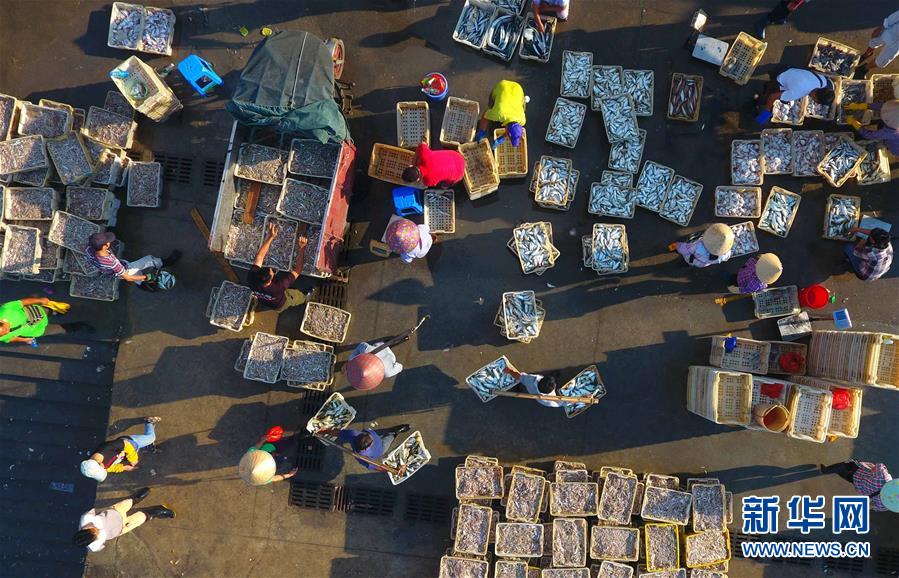 返港漁民在廣西北海市僑港鎮(zhèn)電建漁港的碼頭卸貨(9月26日無人機拍攝)。 新華社記者 黃孝邦 攝