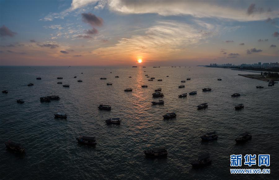 這是夕陽西下時,漁船從廣西北海市銀灘風景區(qū)出海作業(yè)(9月26日無人機拍攝,拼接照片)。 新華社記者 李鑫 攝