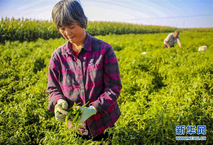 9月28日,饒陽縣留楚鄉(xiāng)影林村的種植戶在摘辣椒。 近年來,河北省饒陽縣結(jié)合市場需求,積極引進(jìn)特色品種辣椒種植,開辟出一條農(nóng)民增收致富新路。目前,該縣特色辣椒種植面積1000余畝,種植戶年均增收3000余元。 新華社記者 李曉果攝