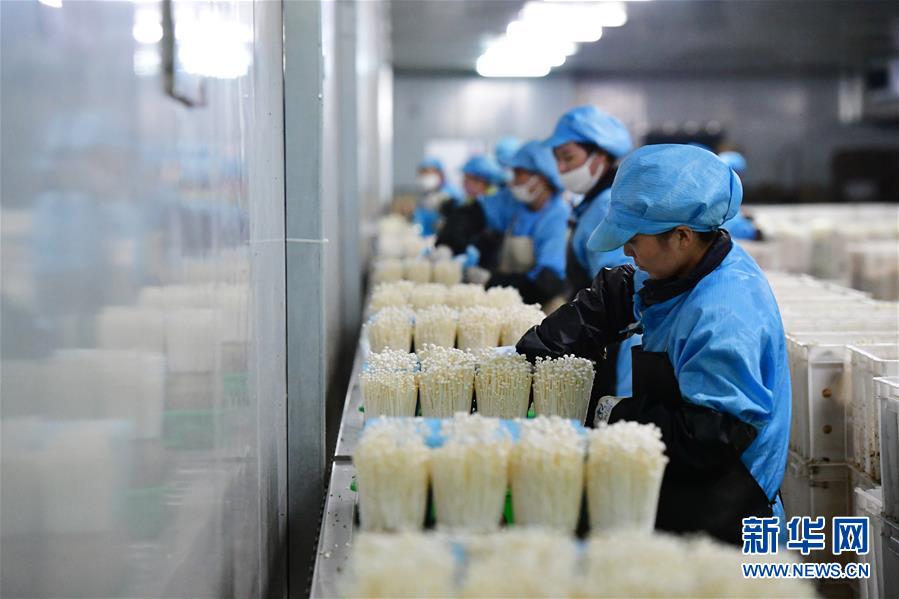 在位于清豐縣的河南龍豐實(shí)業(yè)股份有限公司,工人在包裝車(chē)間流水線上采摘、分揀金針菇(9月28日攝)。新華社記者馮大鵬攝